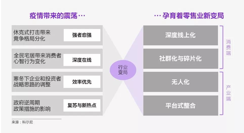 凱度咨詢在近日發布的《疫情之下,各行各業的危與機(二)——零售篇》文中指出,此次疫情對零售行業造成了直接沖擊,但便利店、無人店與自動販賣機等實體零售,各類電商,以及線上與線下的整合零售都出現了新的機遇。 以百貨與購物中心為例,凱度咨詢認為:短期來看,由于疫情導致的客流減少會在不同程度上對實體百貨和購物中心的生意產生影響。而就長期而言,這可能是這些企業加快數字化轉型、加強線上推廣和新工具應用、加快融合線上線下、充分挖掘會員數據的最佳契機。 線上商城、官方微信賬號、微信小程序等百貨或者購物中心自有線上平臺的重要性在今年將得到凸顯。 會員關系管理、數據深度挖掘、個性化產品以及促銷定制、實現高價值高質量的會員和銷售增長將會成為核心策略。 體驗式消費依舊是線下消費的主旋律,不過,如何利用新技術打造沉浸式線上購物體驗也是值得探討的一個話題。 凱度咨詢指出,從短期來看,部分渠道與業態的消費需求提升明顯;就長期而言,這次挑戰對培養新的消費習慣、開啟新的藍海、促進商業轉型與升級將起到重要的推動作用。 -05- 科爾尼(A.T. Kearney) 而管理咨詢公司科爾尼公司發布《海嘯之后,暗潮洶涌——疫情之后的零售業變局》中指出,零售行業是疫情打擊的重災區,對各業態、各品類的影響不盡相同。總體來說,有三大影響: 第一,線上影響弱于線下,生鮮電商變“危”為“機”。預計疫情之后,電商占社會消費品零售總額有望從當前21%進一步提升至24%或更高。 第二,近場受創小于遠場。當前,對于貼近社區的超市、便利店、社區生鮮店等“近場業態”來說,生鮮和生活必需品的核心需求依然強勁,負面影響主要來自一部分政策性閉店要求和防疫措施帶來的成本上升;而“遠場業態”如購物中心、百貨、品類專業店、餐飲則普遍“休克”,現金流危機嚴重。 第三,大平臺韌性強于小平臺。在面對疫情的反應速度、調度能力、運營彈性上,大平臺顯示出了更強的優勢。由細微見大勢,疫情之后,行業洗牌會更加猛烈。