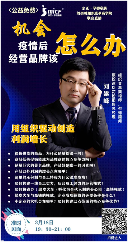 京正·孕嬰童展直播第一講即將開啟~中國嬰童招商網(wǎng)協(xié)辦 時(shí)間:3月18日(周三)19:30 【直播主題】 《疫情彎道超車的新風(fēng)口,用組織驅(qū)動(dòng)創(chuàng)造利潤增長》 【直播導(dǎo)師】 劉崇峰 組織變革架構(gòu)師、咨詢顧問 原松達(dá)松花粉銷售總經(jīng)理 【核心話題】 •疫情后,利潤何以持續(xù)增長? •小企業(yè)的大機(jī)會(huì)在哪里? •綠皮火車到高鐵模式,企業(yè)成功轉(zhuǎn)軌必須要做?