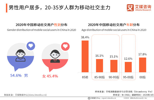 男性用戶居多,20-35歲人群為移動社交主力 iiMedia Research(艾媒咨詢)調研數據顯示,超過半數的移動社交用戶為男性,男性用戶占比為女性用戶兩倍左右;在年齡方面,85-95后占到31.2%,95-00后占到了12.6%,20-35歲人群占到43.8%。