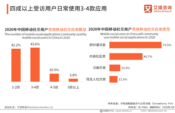 四成以上受訪用戶日常使用3-4款應用 iiMedia Research(艾媒咨詢)調研數據顯示,在常用移動社交應用數量調研中,43.6%的受訪用戶日常使用3-4款應用。而在常用移動社交應用類型方面,微信、QQ為代表的即時通訊類占到絕大比重。艾媒咨詢分析師認為,當前移動社交用戶對社交有著較高需求,社交方式仍以熟人社交為主,隨著移動社交頭部平臺的發展,移動社交用戶更傾向于聚集在產品體系相對完善、用戶體量較大的頭部移動社交平臺上。