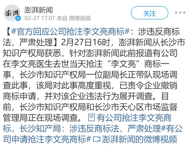 前不久發生一件惹眾怒的事:李文亮醫生才去世,就有公司當天搶注“李文亮”商標。 這是人干的事嗎? 2月27日,長沙市知識產權局責令企業撤銷申請,并且已經對該違法行為展開調查。
