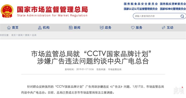 ⊙ 違法案例2-3W咖啡:推出“李克強總理同款咖啡”被罰 2019年1月10日,北京3W咖啡有限公司在經營場所內發布含有“總理同款咖啡”等文字及國家領導人形象的廣告,被北京市工商局海淀分局處罰款20萬元。 ⊙ 違法案例3-中央廣電總臺:“CCTV國家品牌計劃”被調查 2019年1月17日,國家市場監督管理總局針對“CCTV國家品牌計劃”廣告用語涉嫌違反《廣告法》問題約談中央廣電總臺,并責成北京市市場監管局依法立案調查。