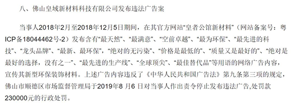 七、表示絕對、極限且無法考證的詞語 10 絕對值、絕對、大牌、精確、超賺、領導品牌、領先上市、巨星、著名、奢侈、世界/全國X大品牌之一、世界級、金牌、名牌、優秀、世界領先、頂級工藝、王牌、銷量冠軍、極致、永久、王牌、掌門人、領袖品牌、絕無僅有、史無前例、萬能、100%、國際品質、高檔、正品等虛假或無法判斷真偽的夸張性表述詞語。 ⊙ 違法案例13-皇域新材料:使用絕對化用語 2019年,佛山皇域新材料科技有限公司發布含有 “龍頭品牌”、“絕對的無污染”、“價格是最低的”、“質量又是最好的”、“絕對是最好的選擇,沒有之一”、“全球頂尖”、“最佳替代品”等用語的廣告,被罰款23萬元。