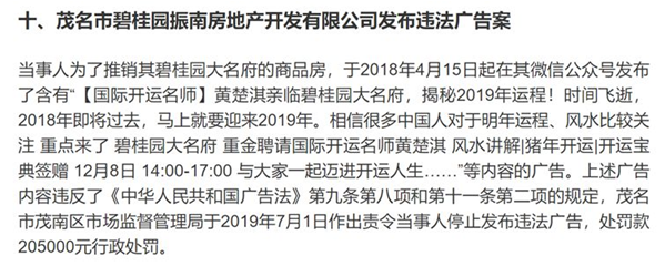 八、迷信用語 11 帶來好運氣,增強第六感、化解小人、增加事業運、招財進寶、健康富貴、提升運氣、有助事業、護身、 平衡正負能量、消除精神壓力、調和氣壓、逢兇化吉、時來運轉、萬事亨通、旺人、旺財、助吉避兇、轉富招福等迷信色彩的用語。 ⊙ 違法案例14-碧桂園:發布風水等迷信內容 2019年,茂名市碧桂園發布“重金聘請國際開運名師黃楚淇風水講解、豬年開運、開運寶典簽贈”的廣告,因涉及迷信內容被罰20.5萬元。