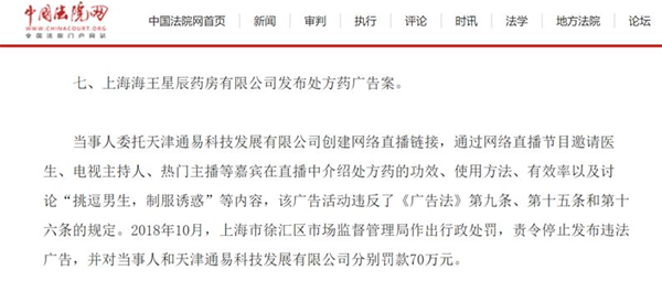 ⊙ 違法案例25-圣洲生物科技:普通食品虛構治療功能被罰 2019年,浙江嘉興圣洲生物科技有限公司因發布涉及疾病治療功能、使用醫療用語的普通食品廣告“巴西蘑菇”,被罰款7.5萬元。