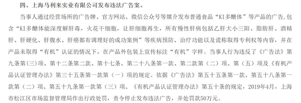 ⊙違法案例24- KI多醣體:虛假宣傳疾病預防功能 2019年12月,上海馬利來實業有限公司因虛假宣傳普通食品“KI多醣體”具有疾病預防、治療功能的廣告,被罰款50萬元。