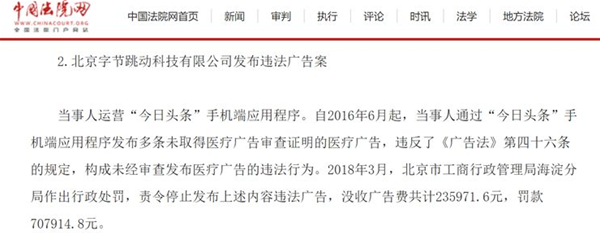 ⊙ 違法案例27-今日頭條:未經審查發布醫療廣告 2018年3月,今日頭條APP因發布多條未取得醫療廣告審查證明的醫療廣告,被沒收廣告費23萬余元,并罰款70.79萬元。