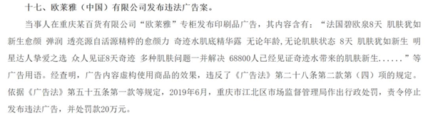 十六、化妝品廣告違禁詞 41 特效、高效、全效、強效、速效、速白、一洗白、XX天見效、XX周期見效、超強、激活、全方位、全面、安全、無毒、溶脂、吸脂、燃燒脂肪、瘦身、瘦臉、瘦腿、減肥、延年益壽、提高(保護)記憶力、提高肌膚抗刺激、消除、清除、化解死細胞、去(祛)除皺紋、平皺、修復斷裂彈性(力)纖維、止脫、采用新型著色機理永不褪色、迅速修復受紫外線傷害的肌膚、更新肌膚、破壞黑色素細胞、阻斷(阻礙)黑色素的形成、豐乳、豐胸、使乳房豐滿、預防乳房松弛下垂(美乳、健美類化妝品除外)、改善(促進)睡眠、舒眠等。 ⊙ 違法案例28-歐萊雅:虛假內容廣告被罰 歐萊雅(中國)有限公司發布 “無論年齡、無論肌膚狀態,8天肌膚猶如新生”等虛構商品使用效果的虛假內容廣告,被罰款20萬元。