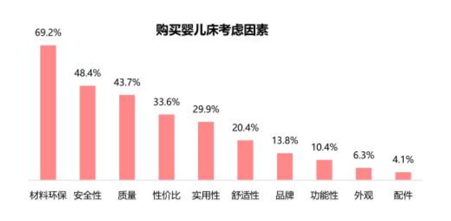 在購買嬰兒床方面,消費者則主要考慮材料環(huán)保、安全性和產(chǎn)品質(zhì)量等因素。在環(huán)保材料選擇方面,無漆無味的環(huán)保木床深受歡迎;在實用性方面,可加長增寬的嬰兒床,以及滿足用戶需求的延展型兒童木床更有市場空間;在功能性方面,與成人床無縫拼接的兒童床、床中床和便捷床更受消費者喜愛。