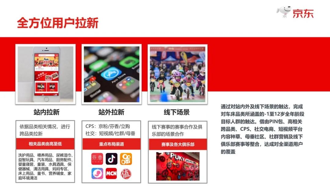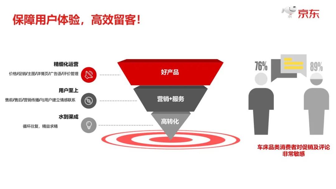 站內(nèi)拉新,可以采用跨品類合作,首選與童車、童車關(guān)聯(lián)度較高的相關(guān)品類,比如嬰童用品、孕產(chǎn)、玩具、童書等,進(jìn)行跨品類聯(lián)動。 站外拉新,則可通過社交電商、短視頻平臺、母嬰社區(qū)、社群營銷及線下俱樂部賽事合作等方式加強用戶滲透和拓展,最終達(dá)成對全渠道用戶的覆蓋。 大數(shù)據(jù)也顯示了客戶維護(hù)方面的關(guān)注重點:76%的車床品類消費者消費者對促銷比較敏感;89%的車床品類消費者則對評論非常敏感。根據(jù)這一數(shù)據(jù)反饋,從產(chǎn)品詳情介紹、促銷方案、價格范圍、廣告營銷、評論管理等方面著手,做好精細(xì)化運營,可以提升用戶體驗,實在高轉(zhuǎn)化和高效留客。 在私域粉絲運營方面,京東也給出了建議: 1. 需要針對專屬化、個性化的粉絲群體特色,搭建與之相符的各種營銷場景,迅速搶占購買用戶心智; 2. 通過各種促銷活動,以及優(yōu)惠券的形式,加大與粉絲之間的互動,定向推廣符合其采購需求的強關(guān)聯(lián)產(chǎn)品; 3. 與此同時,采用店鋪直播X專業(yè)直播、貨品權(quán)益X全面預(yù)告、直播置頂X單品秒殺的直播形式,引導(dǎo)用戶進(jìn)行加購。