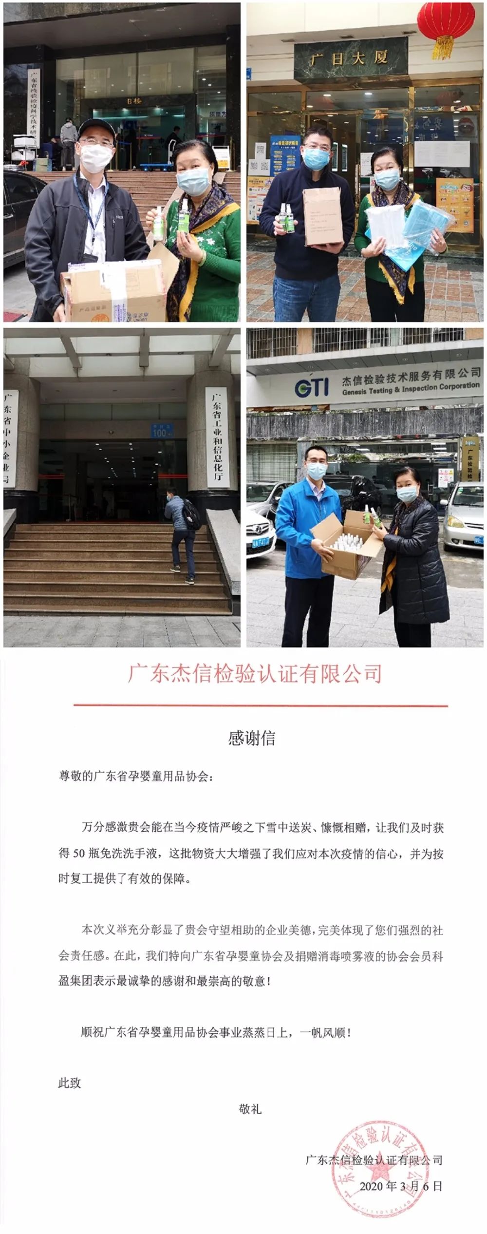 巾幗精神也發(fā)生在我們身邊,疫情發(fā)生以來,廣東省孕嬰童用品協(xié)會(huì)在協(xié)會(huì)理事會(huì)及陳會(huì)長領(lǐng)導(dǎo)下秘書處人員強(qiáng)化使命擔(dān)當(dāng),積極配合政府部門做好疫情防控工作,幫助母嬰企業(yè)在疫情防控、復(fù)工復(fù)產(chǎn)等方面都作出努力和貢獻(xiàn),發(fā)揮引領(lǐng)作用增強(qiáng)行業(yè)信心。在這期間協(xié)會(huì)秘書處的付出也得到了會(huì)員企業(yè)的關(guān)愛,佛山親子坊婦嬰用品有限公司、廣東科盈科技有限公司分別為協(xié)會(huì)秘書處送來洗手液、消毒液等疫情防控等用品,關(guān)愛協(xié)會(huì)秘書處人員身體健康安全。
