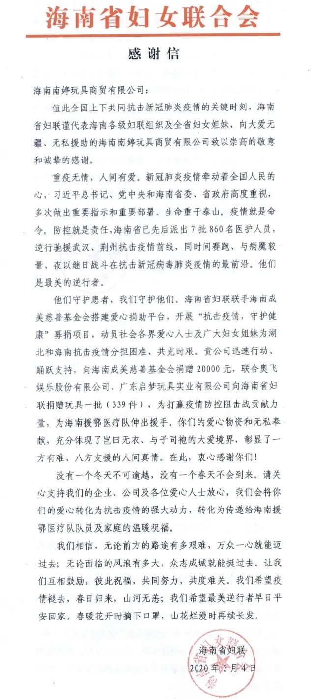 2020的新年是特殊的,“新型冠狀病毒”猶如一只強大的年獸席卷了全國。艱難困苦,玉汝于成。幾十年來我們的國家經歷過這樣那樣的風雨考驗,但前進的腳步從來沒有停滯,同為炎黃子孫,一方有難八方支援就是我們的底氣! 自疫情開始以來,南婷玩具在做好公司小伙伴安全防護的同時,積極履行自己應擔當的社會責任,先后通過團省委、省婦聯、市工商聯等渠道貢獻南婷及伙伴之力,助力最前線,關愛大后方。 愛在 家庭里