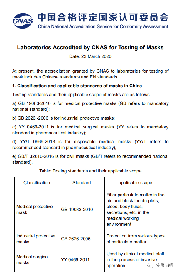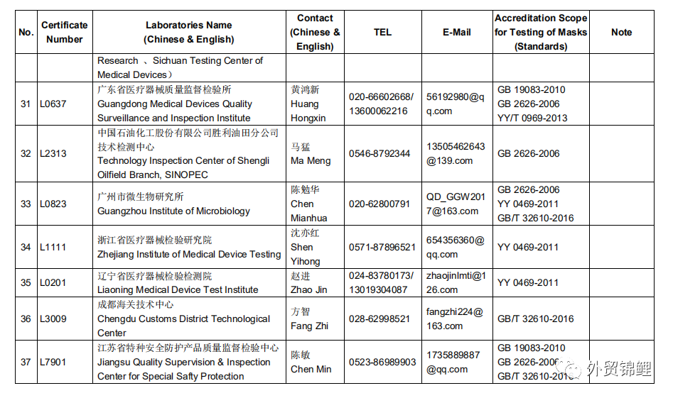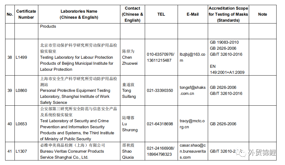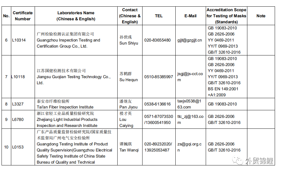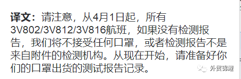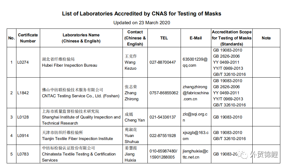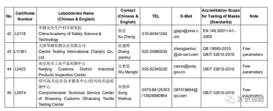 要點(diǎn):檢測(cè)報(bào)告必須是CNAS 指定的46家檢測(cè)機(jī)構(gòu)認(rèn)證的才有效,其他任何機(jī)構(gòu)認(rèn)證的都作無(wú)效處理,航司/船期會(huì)拒絕裝載貨物。如果有近期出口罩的伙伴務(wù)必要核實(shí)自己的檢測(cè)報(bào)告是否有效,以下為官方認(rèn)可的檢測(cè)機(jī)構(gòu),如需完整表單找小編索取。