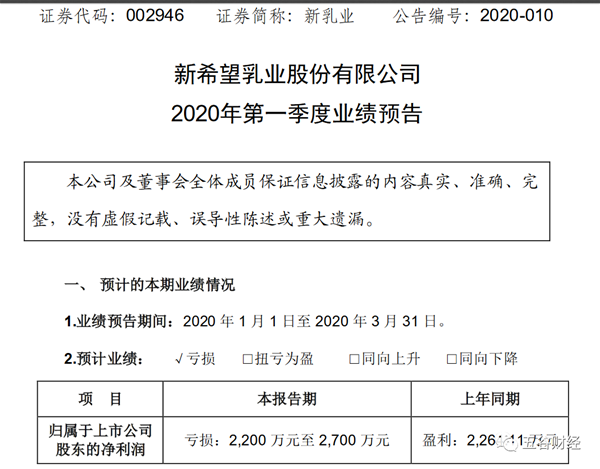 4月15日午間,新乳業(yè)(全稱“新希望乳業(yè)股份有限公司”)公開了2020年第一季度業(yè)績預(yù)告,受新冠疫情影響,新乳業(yè)經(jīng)營和對聯(lián)營公司的投資收益受到負(fù)面沖擊,預(yù)計2020年第一季度業(yè)績將出現(xiàn)虧損。 公告顯示,2020年第一季度,新乳業(yè)歸屬于上市公司股東的凈利潤虧損2200萬元至2700萬元,而去年同期盈利2264萬元左右。