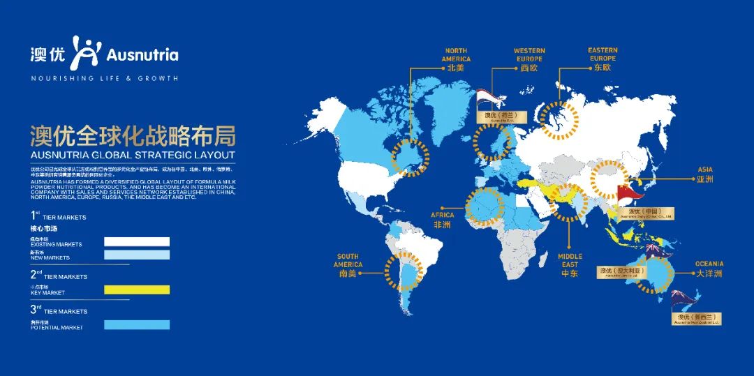 市場競爭白熱化下,澳優(yōu)緊跟市場變化,不斷優(yōu)化佳貝艾特、海普諾凱、營養(yǎng)品品牌Nutrition Care等產(chǎn)品結(jié)構(gòu),也助力了澳優(yōu)在競爭浪潮中的穩(wěn)步發(fā)展。 加速全球化布局,持續(xù)發(fā)力全球供應(yīng)鏈 2019年,國家七部委聯(lián)合發(fā)布了《國產(chǎn)嬰幼兒配方乳粉提升行動方案》,大力支持國產(chǎn)嬰幼兒配方乳粉“品質(zhì)提升、產(chǎn)業(yè)升級、品牌培育”三大行動計劃。支持國內(nèi)企業(yè)在境外收購和建設(shè)奶源基地,降低原料成本。鼓勵有實力、信譽好的企業(yè)在國外設(shè)立加工廠,并將生產(chǎn)的產(chǎn)品以自有品牌原裝進口。鼓勵國外乳粉企業(yè)在國內(nèi)設(shè)立外商投資企業(yè),促進中國品牌與外國品牌公平競爭,引入國外先進的生產(chǎn)技術(shù)及管理經(jīng)驗,豐富國內(nèi)產(chǎn)品供應(yīng)。 國家鼓勵性政策的出臺不僅助推了澳優(yōu)加速布局國際化,更彰顯了澳優(yōu)超前發(fā)展的市場格局和思維。澳優(yōu)在2003年成立之初,企業(yè)發(fā)展定位就是具有影響力的國際化乳企。為了更好走出國門,澳優(yōu)在2011年開始正式布局海外。
