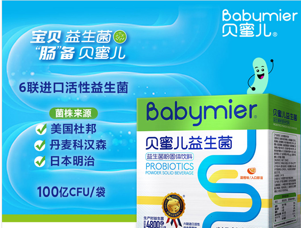 貝蜜兒益生菌產品優勢: l、選用國家衛計委批準可用于嬰幼兒食品的菌種; 美國杜邦:鼠李糖乳桿菌HN001+乳雙歧桿菌HN019、Bi-07; 丹麥進口:鼠李糖乳桿菌Lgg +動物雙歧桿菌Bb-12; 日本進口:短雙歧桿菌M-16V; 2、高含量,每袋100億CFU活菌; 3、5種益生元,并采用凍干技術,保證益生菌高活性; ![]() |