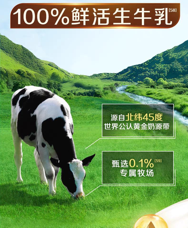 為了給寶寶更優質的營養,金領冠育護也從奶源入手下功夫。其臻選北緯45°全球公認黃金奶源帶的伊利自有0.1%專屬牧場[5],黃金乳蛋白含量高于國家和歐盟的標準,且運輸全程鎖鮮,原奶2小時直達工廠、100%生牛乳一次成粉,更大限度保留多種營養素活性,給寶寶帶來鮮活好營養。