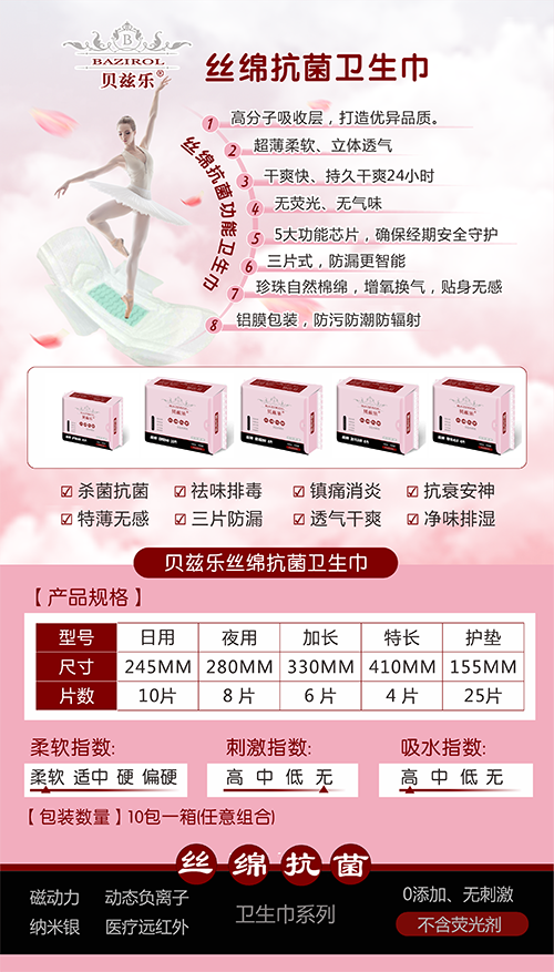 - 產品規格:護墊155mmX25片、日用245mmX10片、夜用280mmX8片、加長330mmX6片、特長410mmX4片