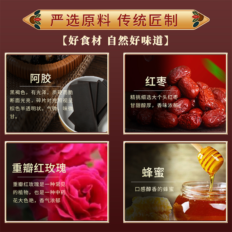 【配 料】阿膠、重瓣紅玫瑰、姜、紅棗、紅糖、白砂糖、蜂蜜